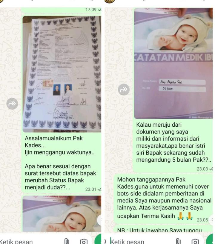Untuk menggali kebenaran tersebut, media mencoba mengkonfirmasi kepada desa Sumber Sari melalui Chat WhatsApp Pribadi miliknya guna memastikan desas – densus dikalangan masyarakat serta kebenaran salinan dokumen yang dimiliki wartawan, namun sangat disayangkan,Ia lebih memilih bungkam daripada memberi keterangan sebagai asas praduga tidak bersalah yang menjadi haknya.