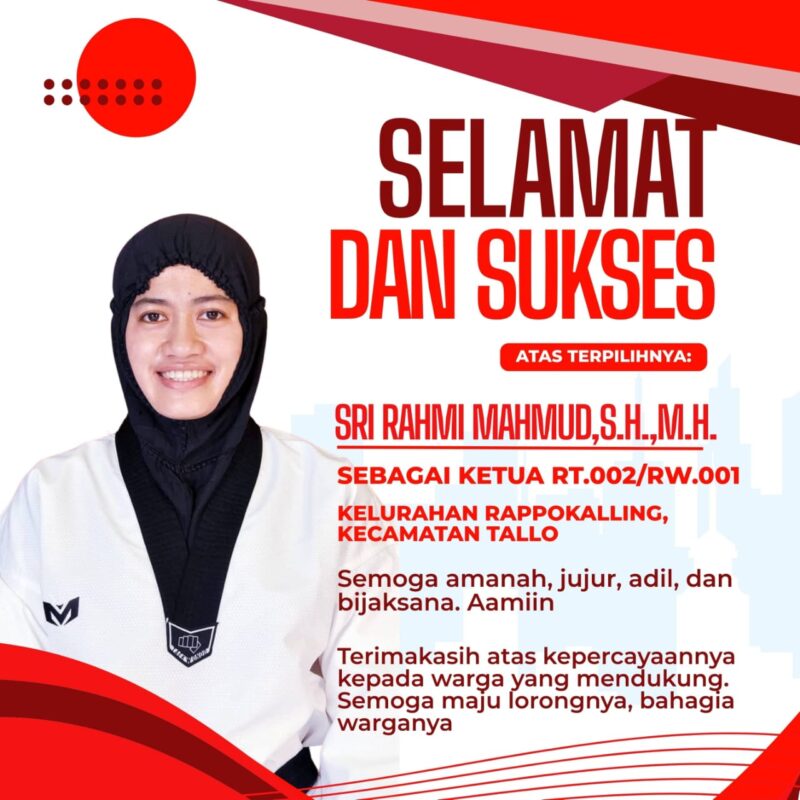 Berbagai Ucapan Selamat dan Sukses menghampiri Sri Rahmi Mahmud baik secara langsung maupun tidak langsung telah terpilih menjadi Ketua RT 002 RW 002 Kelurahan Rappokalling Kecamatan Tallo Kota Makassar.
