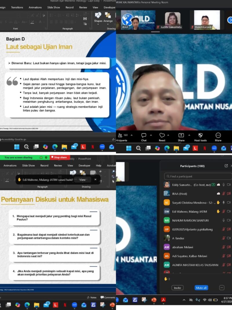 Kalimantan, 27 April 2026 – Proses pembelajaran yang memadukan dimensi akademik dan spiritual kembali ditunjukkan dalam perkuliahan Maritime Theology di BILD Institute Kalimantan Nusantara. Dipimpin oleh Prof. Dr. Capt. Eddy Sumartono, DBA, PhD, kegiatan ini diikuti oleh 180 mahasiswa dari jenjang S1, S2, hingga S3 dalam satu sesi daring yang berlangsung interaktif dan penuh makna.