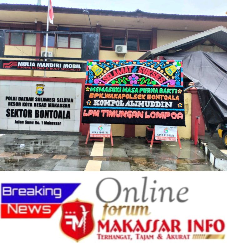FORUMMAKASSARINFO.COM-Makassar – Wakapolsek Bontoala Kompol Alimuddin telah memasuki masa purna bakti terhitung sejak tanggal 1 Februari 2025 besok karenanya ada beberapa yang mengirimkan karangan bunga sebagai bentuk apresiasi dan penghargaan.