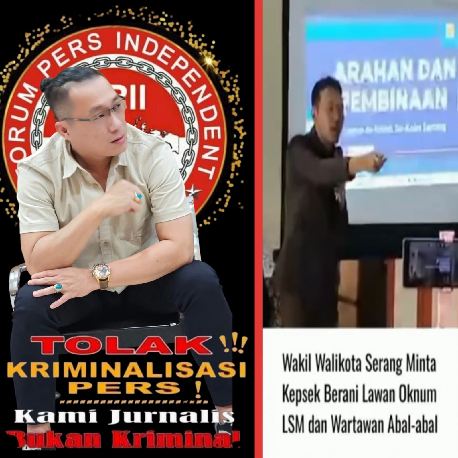 Kami Organisasi Pers Forum Pers Independent Indonesia kecam keras dan ingatkan Wakil Walikota Serang jangan membuat pernyataan yang tidak etis dan menyebarkan kebencian terhadap insan pers , karena pernyataan ini memperkuat pentingnya ruang demokrasi dan kebebasan pers sebagai pilar dalam sistem pemerintahan yang transparan dan akuntabel.