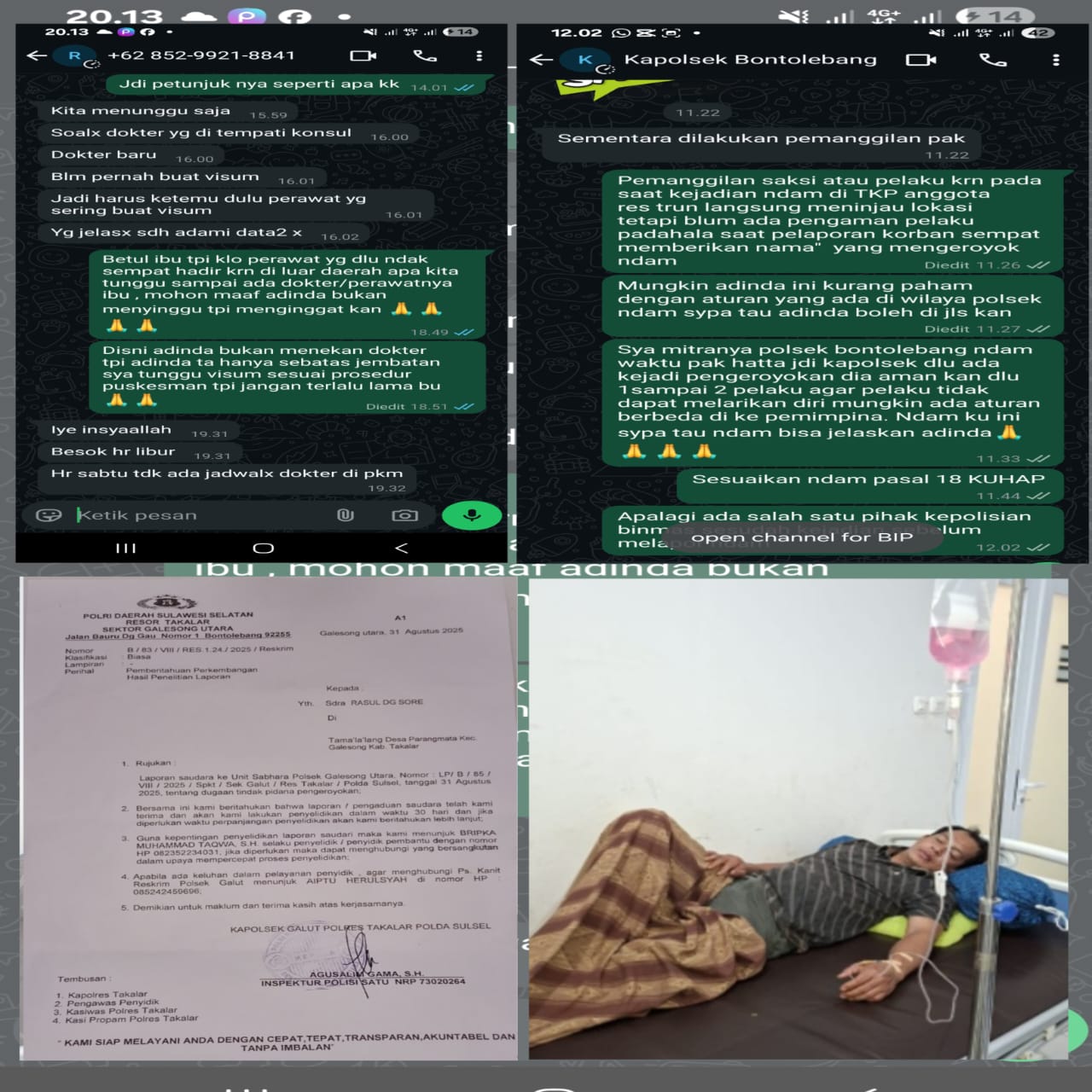 Kapolsek Bontolebang, saat dikonfirmasi melalui WhatsApp, menyebut bahwa penanganan masih dalam tahap pemanggilan saksi. Kanit Reskrim Polsek Bontolebang menambahkan, pihaknya masih menunggu keterangan saksi lain serta hasil visum dari Puskesmas Bontolebang.