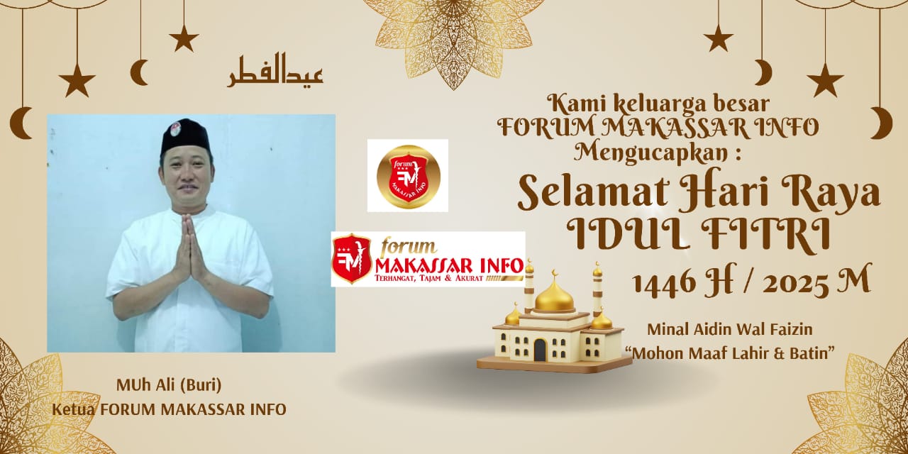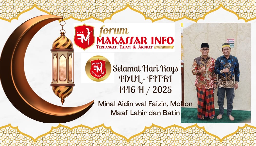 FORUMMAKASSARINFO.COK-MAKASSAR, – Segenap Keluarga Besar Forum Makassar Info Mengucapkan Selamat Hari Raya Idul Fitri 1446 H / 2025 M “Taqabbalallahu Minna Wa Minkum Taqobbal Ya Karim, Minal Aidin Wal Faizin Mohon Maaf Lahir dan Batin”. Selamat Hari Raya Idul Fitri 1 Syawal 1446 Hijriah, Senin 31 Maret 2025 Masehi.