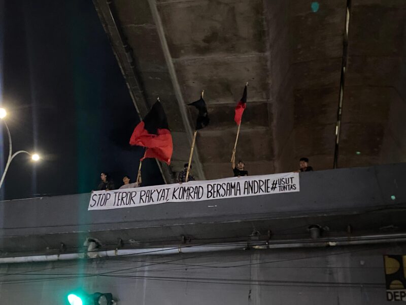 forummakassarinfo.com,-Makassar,-Terlihat, spanduk yang bertuliskan stop teror rakyat, komrad bersama andrie dibentangkan sembari mengibarkan bendera berwarna hitam merah