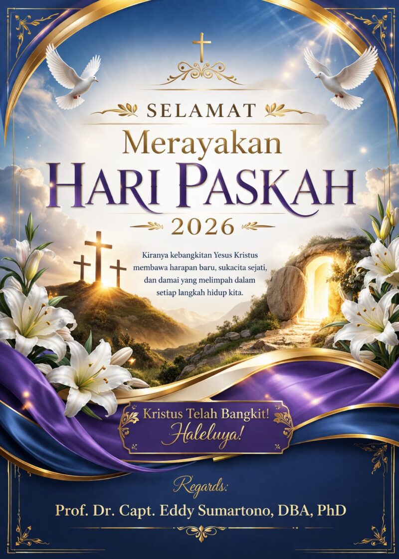 FORUM MAKASSAR INFO.COM- Perayaan Hari Paskah 2026 kembali menjadi momentum refleksi spiritual yang mendalam bagi umat Kristiani di seluruh dunia. Tahun ini, nuansa kebangkitan Kristus tidak hanya dirayakan dalam ibadah dan persekutuan, tetapi juga disampaikan melalui pesan inspiratif yang menyentuh hati. Salah satunya datang dari tokoh akademisi dan praktisi maritim terkemuka, Prof. Dr. Capt. Eddy Sumartono, DBA, PhD, yang menyampaikan ucapan penuh makna melalui sebuah kartu ucapan elegan bernuansa emas, putih, ungu, dan biru.