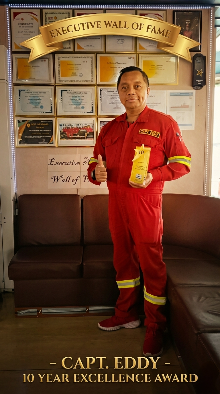 Executive Offshore memberikan penghargaan 10 Year Excellence Award sebagai bentuk apresiasi tertinggi kepada individu yang menunjukkan kinerja unggul secara berkelanjutan. Dalam penilaian perusahaan, Capt. Eddy dikenal sebagai pemimpin yang tegas namun adil, disiplin namun komunikatif, serta konsisten dalam menerapkan budaya keselamatan kerja. Ia tidak hanya mematuhi aturan, tetapi memastikan setiap awak kapal memahami pentingnya keselamatan sebagai nilai utama, bukan sekadar prosedur.