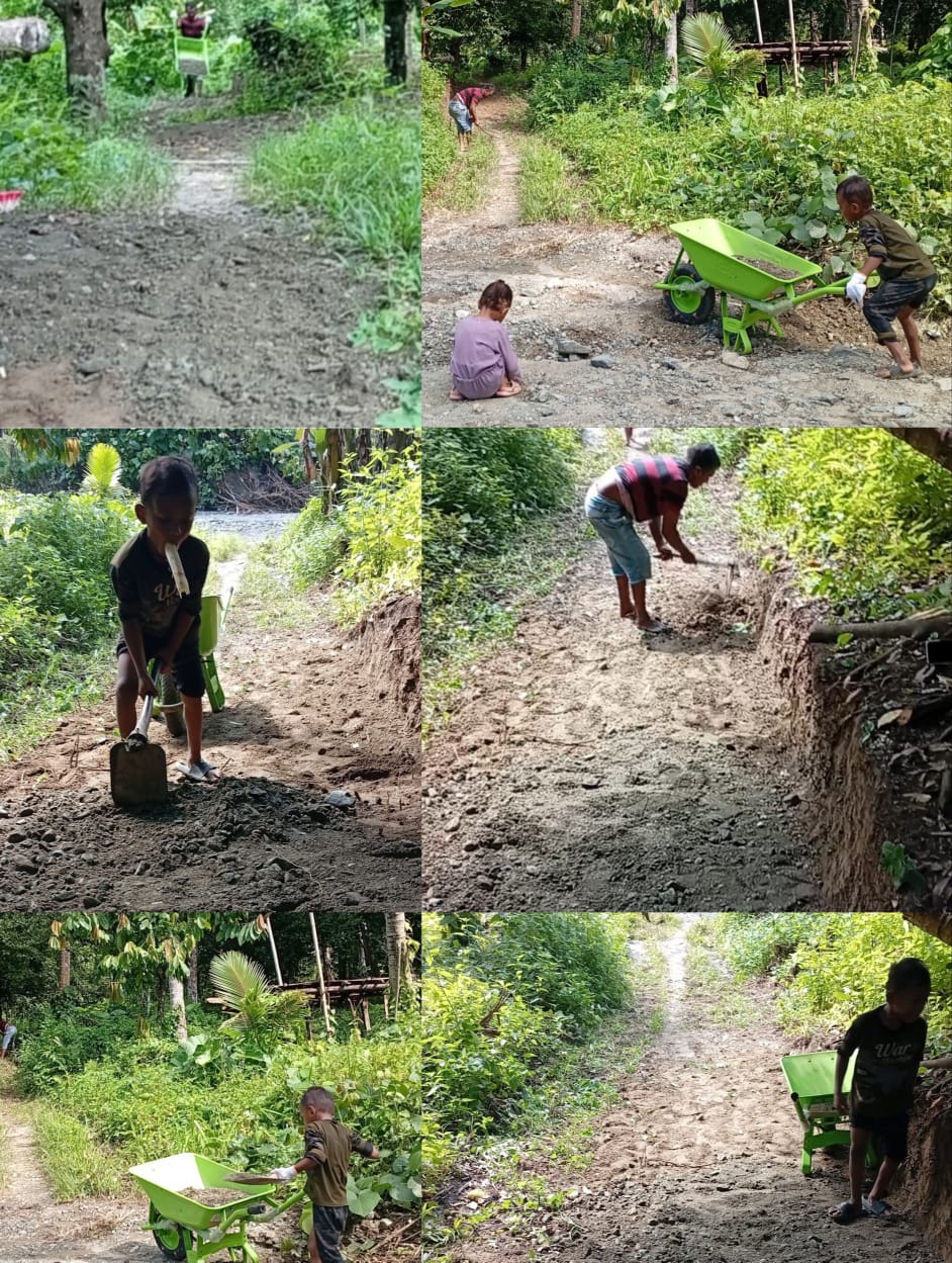 Terlihat anak kelas ll SDN 168 Halsel, Dilan Sukandi membantu ayahnya membuka badan jalan langsung sirtu menggunakan pasir kali dengan alat seadanya yang dipakai berupa sekop, pacol dan satu buah argo.